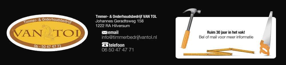 Zoekt u iemand voor ambachtelijk timmerwerk? Dan bent u aan het juiste adres bij Timmer- & Onderhoudsbedrijf Rob van Tol. Als het gaat om verbouw, onderhoud of renovatie van uw huis, Rob doet het allemaal. Ook voor dakkapellen, kozijnen, veranda’s, sauna’s of een prieel kunt u contact opnemen.